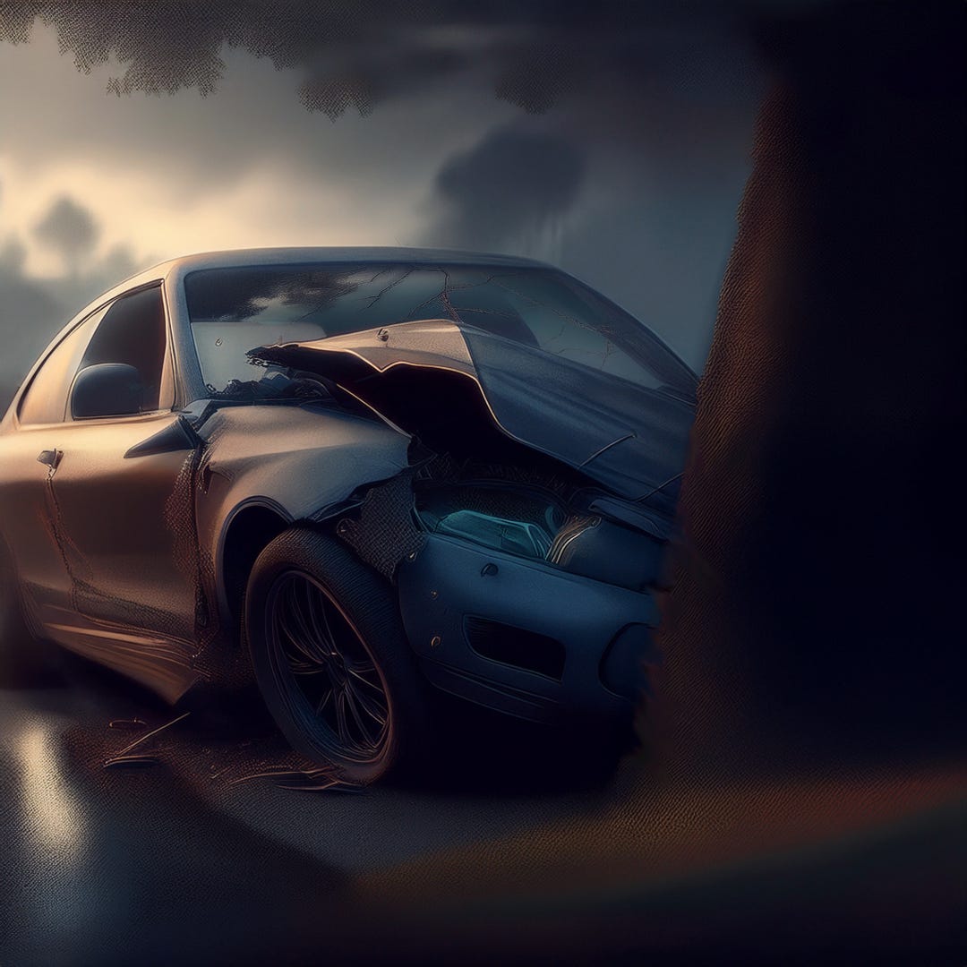 The final question flashes through her mind as the car leaves the road, the world tilting. Oh my God... The thought hangs in the air as the car collides with a massive tree, the front cabin crumpling like a soda can.