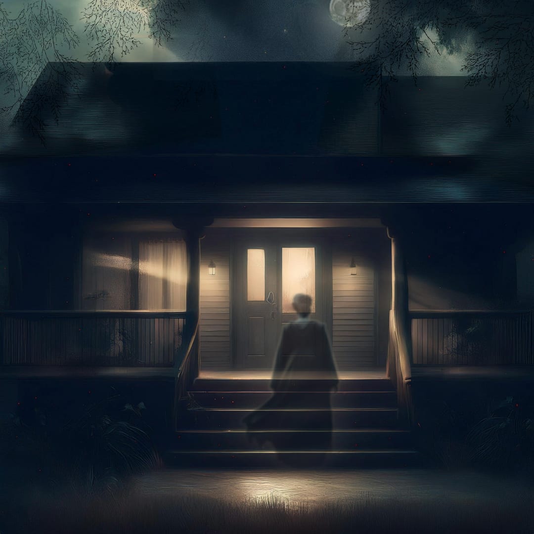 He is waiting for a reply when the hairs on the back of his neck begin to prickle, a sudden, unavoidable sense of not being alone. He turns off his phone screen, plunging the room into darkness save for the dim light from the front porch filtering through the bedroom window. The window shade, normally closed as part of his nightly ritual, is still open. He sighs, pulls back the covers, and steps out of bed to close the shade, unconsciously glancing out the window.