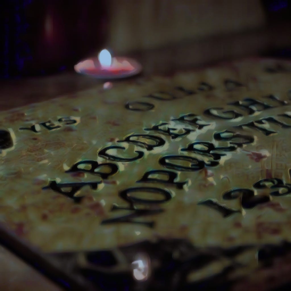 The planchette trembles like an inverted heart beating erratically, then begins its journey across the board. It falters, shakes as if an unseen hand is trying to hold it back, but with a final, determined push, it lands on the letter I.